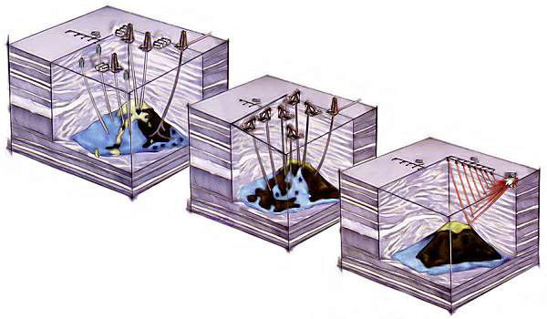 عبر عملية ضخ النفط من الآبار الإنتاجية غالبا ما تسحب هذه الآبار المياه من الأسفل والغاز من الأعلى، فتملأ مسامات في الطبقة الخازنة كانت قبل ذلك مشبعة بالنفط، مما يبقي جيوبا معزولة من النفط بعيدة عن الآبار المنتجة. وهذا يجعل الآبار المحفورة بالتقانات التقليدية تخسر حتى ثلثي كميات النفط الموجودة في الطبقة الخازنة. ولكن المسوح السيزمية المتكررة ـ ويمكن حاليا جمعها تحت نموذج رباعي الأبعاد ـ تستطيع، ليس فقط تحديد مواقع النفط والغاز والماء في الحقل النفطي، بل تستطيع أيضا التنبؤ باتجاهات حركتها المقبلة. وهكذا يؤدي المسح السيزمي المتقدم دوره بشكل جيد فيما يقرب من نصف حقول العالم النفطية؛ ولكنه يخفق عندما يكون النفط مدفونا في الصخور القاسية جدا أو تحت طبقات الملح الصخري (طبقة سميكة بيضاء)
