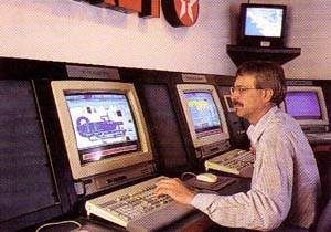 عبر مراكز القيادة، كالذي تعرضه هذه الصورة والواقع في نيوأورليانز، يمكن للجيولوجيين والمهندسين رصد تجهيزات الحفر والإنتاج وحتى التحكم فيها عن بعد في حقول النفط النائية، وذلك عبر السواتل (الأقمار الصنعية) والاتصالات بالموديم modem connections. وهكذا تستطيع شركات النفط اليوم عبر الاتصالات الرقمية المعماة (المشفَّرة) encrypted، تشخيص المشكلات المتعلقة بعملية الإنتاج بشكل أسرع، وتوفير التكاليف المرتبطة بانتقال الخبراء جوا حول العالم